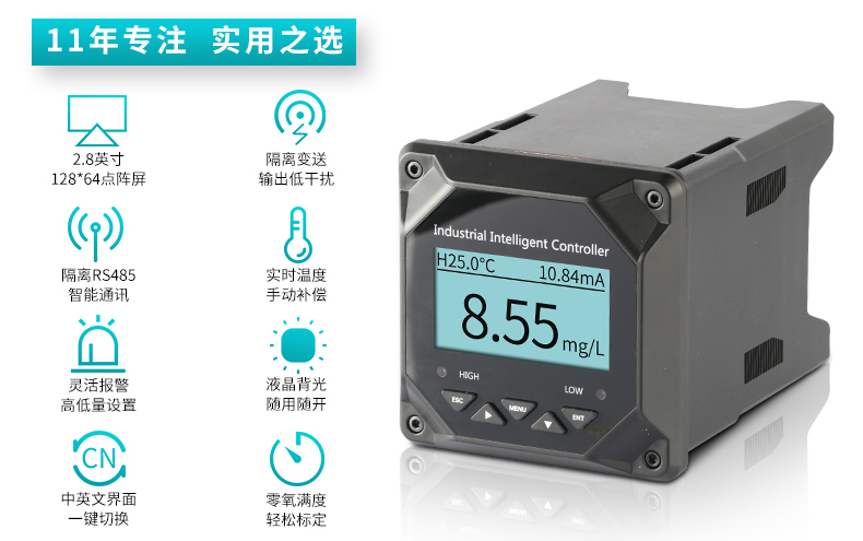 4、可進行DO/SAT/OPP的測量、溫度測量、上下限控制、變送輸出、RS485通訊
