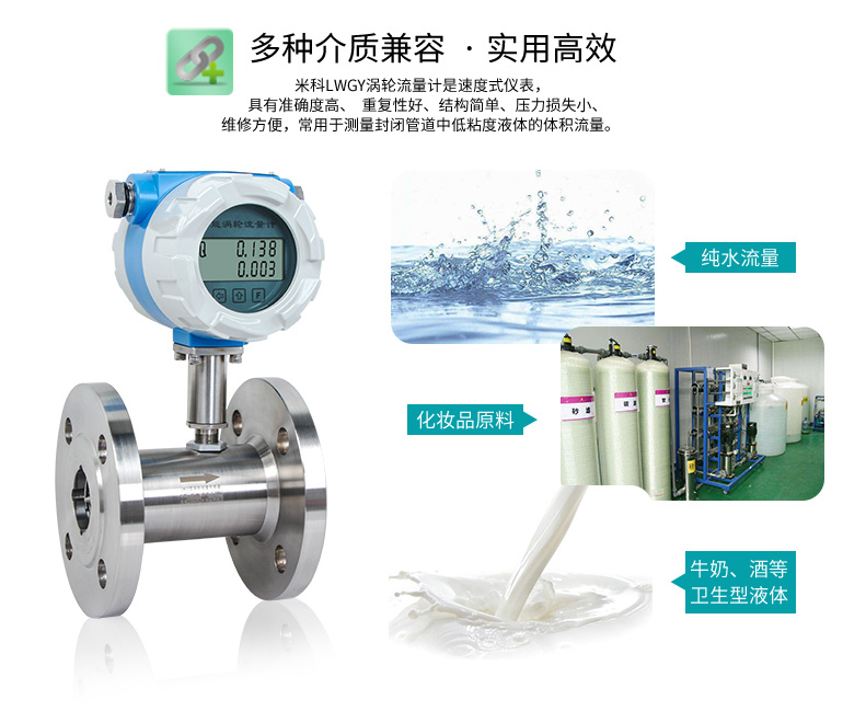 LWGY-MIK系列液體渦輪流量計是一種速度式儀表,它具有準確度高、重復性好、結構簡單、壓力損失小、維修方便等優點,用于測量封閉管道中低粘度液體的體積流量。在石油、化工、冶金、供水、造紙等行業中具有廣泛的應用。
