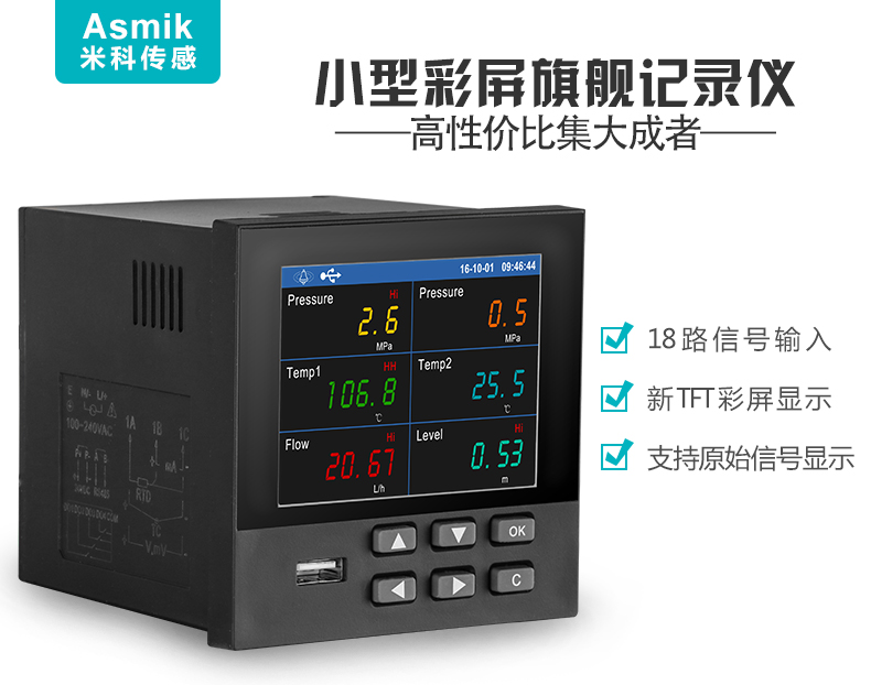 MIK-R9600無紙記錄儀集各種工業(yè)、民用場合中數(shù)據(jù)的測量、顯示、處理、運算、報警、記錄報表等多種功能于一身,具有18路模擬量信號輸入通道、4路繼電器報警輸出、150mA配電輸出(可接6路兩線制變送器或者2路四線制變送器),1個RS-485通訊接口,并擁有1個USB數(shù)據(jù)轉(zhuǎn)存接口。