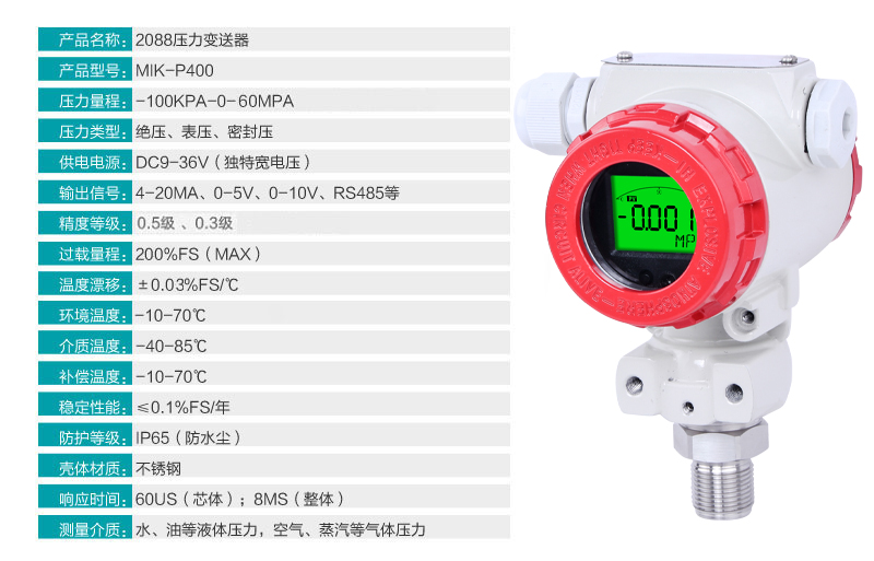 MIK-P400型工業型壓力變送器采用OEM全焊接壓力芯體,微型放大器處理電路。零點量程可遷移。其安裝接口形式,即可根據用戶的要求加工,可提供與其他品牌變送器兼容的規格。該系列產品廣泛應用于工業過程控制、液壓設備、化工等行業。針對工業現場環境比較惡劣的情況該產品有比較明顯的優勢,其防護等級達到IP67。
