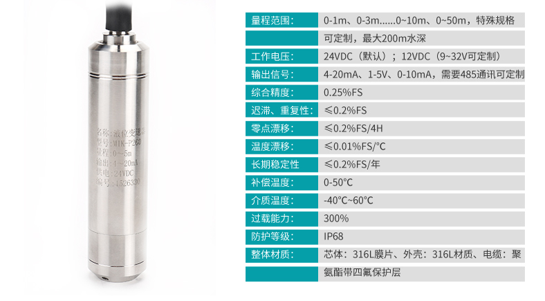 適用場合:投入式液位變送器是基于所測液體靜壓與該液體高度成正比的原理,采用擴散硅或陶瓷敏感元件的壓阻效應,將靜壓轉成電信號。經過溫度補償和線性校正。轉換成4-20mADC標準電流信號輸出。投入式液位變送器的傳感器部分可直接投入到液體中,變送器部分可用法蘭或支架固定,安裝使用極為方便。